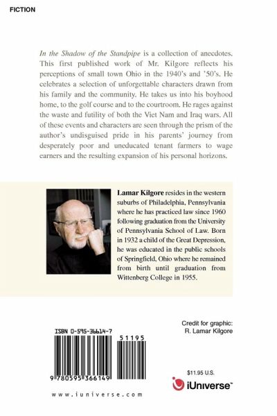 In the Shadow of the Standpipe is a collection of anecdotes. This first published work of Mr. Kilgore reflects his perceptions of small town Ohio in the 1940's and '50's. He celebrates a selection of unforgettable characters drawn from his family and the community. He takes us into his boyhood home, to the golf course and to the courtroom. He rages against the waste and futility of both the Viet Nam and Iraq wars. All of these events and characters are seen through the prism of the author's undisguised pride in his parents' journey from desperately poor and uneducated tenant farmers to wage earners and the resulting expansion of his personal horizons.