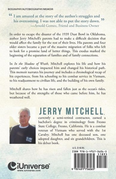 I am amazed at the story of the author's struggles and his overcoming. I was not able to put the story down. -Arnold Gomez, Friend and Business Owner In order to escape the disaster of the 1939 Dust Bowl in Oklahoma, author Jerry Mitchell's parents had to make a difficult decision that would affect the family for the rest of their lives. His parents and four older sisters became a part of the massive migration of folks who left to look for a promise land of better things. This exodus marked the beginning of the separation of families and of family connections. In In the Shadow of Wrath, Mitchell explores his life and how his parents' early choices impacted him and changed his historical path. This memoir narrates his journey and includes a chronological recap of his experiences, from his schooling to his combat service in Vietnam, to his readjustment to civilian life, and the building of his own family. Mitchell shares how he has risen and fallen just as the ocean's tides, but because of the strengths of those who came before him, he has weathered well.