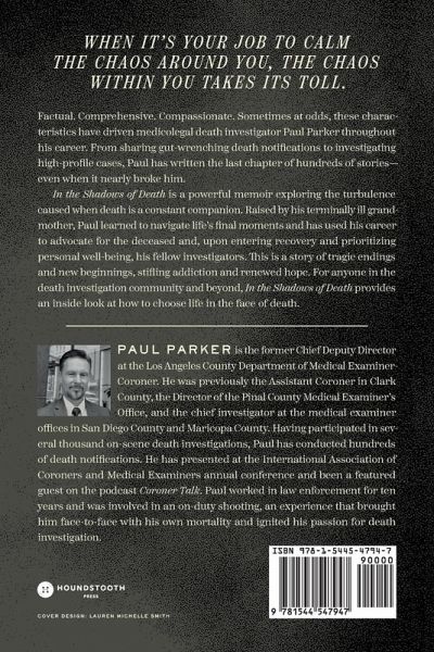 When it's your job to calm the chaos around you, the chaos within you takes its toll. Factual. Comprehensive. Compassionate. Sometimes at odds, these characteristics have driven medicolegal death investigator Paul Parker throughout his career. From sharing gut-wrenching death notifications to investigating high-profile cases, Paul has written the last chapter of hundreds of stories-even when it nearly broke him. In the Shadows of Death is a powerful memoir exploring the turbulence caused when death is a constant companion. Raised by his terminally ill grandmother, Paul learned to navigate life's final moments and has used his career to advocate for the deceased and, upon entering recovery and prioritizing personal well-being, his fellow investigators. This is a story of tragic endings and new beginnings, stifling addiction and renewed hope. For anyone in the death investigation community and beyond, In the Shadows of Death provides an inside look at how to choose life in the face of death.
