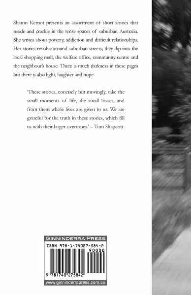 Sharon Kernot presents an assortment of short stories that reside and crackle in the tense spaces of suburban Australia. She writes about poverty, addiction and difficult relationships. Her stories revolve around suburban streets; they dip into the local shopping mall, the welfare office, community centre and the neighbour's house. There is much darkness in these pages but there is also light, laughter and hope. 'These stories, concisely but movingly, take the small moments of life, the small losses, and from them whole lives are given to us. We are grateful for the truth in these stories, which fill us with their larger overtones.' - Tom Shapcott