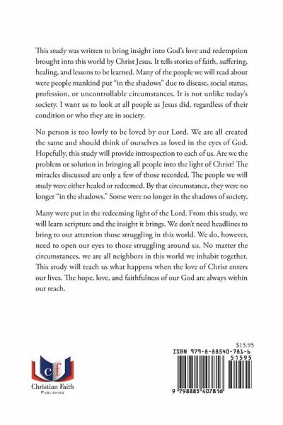 This study was written to bring insight into God's love and redemption brought into this world by Christ Jesus. It tells stories of faith, suffering, healing, and lessons to be learned. Many of the people we will read about were people mankind put "in the shadows" due to disease, social status, profession, or uncontrollable circumstances. It is not unlike today's society. I want us to look at all people as Jesus did, regardless of their condition or who they are in society. No person is too lowly to be loved by our Lord. We are all created the same and should think of ourselves as loved in the eyes of God. Hopefully, this study will provide introspection to each of us. Are we the problem or solution in bringing all people into the light of Christ? The miracles discussed are only a few of those recorded. The people we will study were either healed or redeemed. By that circumstance, they were no longer "in the shadows." Some were no longer in the shadows of society. Many were put in the redeeming light of the Lord. From this study, we will learn scripture and the insight it brings. We don't need headlines to bring to our attention those struggling in this world. We do, however, need to open our eyes to those struggling around us. No matter the circumstances, we are all neighbors in this world we inhabit together. This study will teach us what happens when the love of Christ enters our lives. The hope, love, and faithfulness of our God are always within our reach.