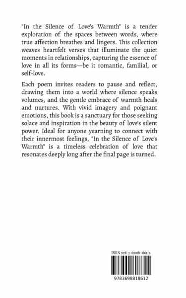 "In the Silence of Love's Warmth" is a tender exploration of the spaces between words, where true affection breathes and lingers. This collection weaves heartfelt verses that illuminate the quiet moments in relationships, capturing the essence of love in all its forms-be it romantic, familial, or self-love. Each poem invites readers to pause and reflect, drawing them into a world where silence speaks volumes, and the gentle embrace of warmth heals and nurtures. With vivid imagery and poignant emotions, this book is a sanctuary for those seeking solace and inspiration in the beauty of love's silent power. Ideal for anyone yearning to connect with their innermost feelings, "In the Silence of Love's Warmth" is a timeless celebration of love that resonates deeply long after the final page is turned.