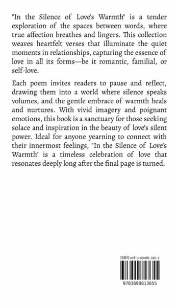 "In the Silence of Love's Warmth" is a tender exploration of the spaces between words, where true affection breathes and lingers. This collection weaves heartfelt verses that illuminate the quiet moments in relationships, capturing the essence of love in all its forms-be it romantic, familial, or self-love. Each poem invites readers to pause and reflect, drawing them into a world where silence speaks volumes, and the gentle embrace of warmth heals and nurtures. With vivid imagery and poignant emotions, this book is a sanctuary for those seeking solace and inspiration in the beauty of love's silent power. Ideal for anyone yearning to connect with their innermost feelings, "In the Silence of Love's Warmth" is a timeless celebration of love that resonates deeply long after the final page is turned.