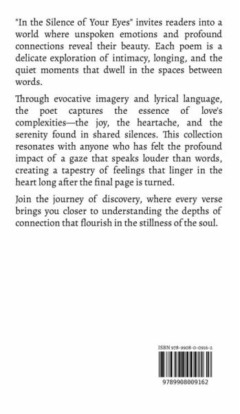 "In the Silence of Your Eyes" invites readers into a world where unspoken emotions and profound connections reveal their beauty. Each poem is a delicate exploration of intimacy, longing, and the quiet moments that dwell in the spaces between words. Through evocative imagery and lyrical language, the poet captures the essence of love's complexities-the joy, the heartache, and the serenity found in shared silences. This collection resonates with anyone who has felt the profound impact of a gaze that speaks louder than words, creating a tapestry of feelings that linger in the heart long after the final page is turned. Join the journey of discovery, where every verse brings you closer to understanding the depths of connection that flourish in the stillness of the soul.