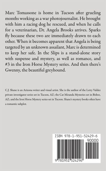 Marc Tomassone is home in Tucson after grueling months working as a war photojournalist. He brought with him a racing dog he rescued, and when he calls for a veterinarian, Dr. Angela Brooks arrives. Sparks fly because these two are immediately drawn to each other. When it becomes apparent that Angela is being targeted by an unknown assailant, Marc is determined to keep her safe. In the Slips is a stand-alone story with suspense and mystery, as well as romance, and #3 in the Iron Horse Mystery series. And then there's Gwenny, the beautiful greyhound.