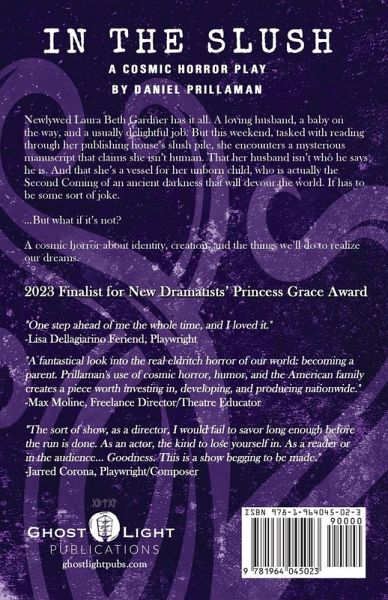 A horror stage play by Daniel Prillaman. 2023 FINALIST FOR NEW DRAMATISTS' PRINCESS GRACE AWARD Newlywed Laura Beth Gardner has it all. A loving husband, a baby on the way, and a usually delightful job. But this weekend, tasked with reading through her publishing house's slush pile, she encounters a mysterious manuscript that claims she isn't human. That her husband isn't who he says he is. And that she's a vessel for her unborn child, who is actually the Second Coming of an ancient darkness that will devour the world. It has to be some sort of joke. ...But what if it's not? A cosmic horror about identity, creation, and the things we'll do to realize our dreams.
