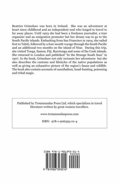 Beatrice Grimshaw was born in Ireland. She was an adventurer at heart since childhood and an independent soul who longed to travel to far away places. Until 1903 she had been a freelance journalist, a tour organiser and an emigration promoter but her dream was to go to the South Pacific islands. Embarking from San Francisco in 1904, she sailed first to Tahiti, followed by a four month voyage through the South Pacific and an additional two months on the island of Niue. During this trip, she visited Tonga, Samoa, Fiji, Rarotonga and some of the Cook islands. She returned to London and published "In the Strange South Seas" in 1907. In the book, Grimshaw not only recounts her adventures but she also describes the customs and lifestyles of the native populations as well as giving an exhaustive picture of the region's fauna and wildlife. The book also contain accounts of cannibalism, head-hunting, poisoning and tribal magic.