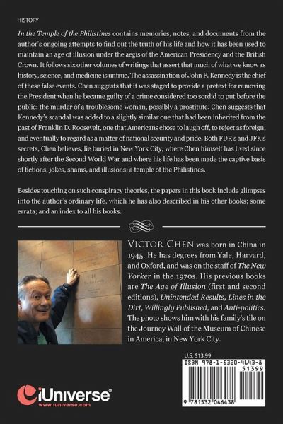 In the Temple of the Philistines contains memories, notes, and documents from the authors ongoing attempts to find out the truth of his life and how it has been used to maintain an age of illusion under the aegis of the American Presidency and the British Crown. It follows six other volumes of writings that assert that much of what we know as history, science, and medicine is untrue. The assassination of John F. Kennedy is the chief of these false events. Chen suggests that it was staged to provide a pretext for removing the President when he became guilty of a crime considered too sordid to put before the public: the murder of a troublesome woman, possibly a prostitute. Chen suggests that Kennedys scandal was added to a slightly similar one that had been inherited from the past of Franklin D. Roosevelt, one that Americans chose to laugh off, to reject as foreign, and eventually to embrace out of stubborn patriotism. Both FDRs and JFKs secrets, Chen believes, lie buried in New York City, where Chen himself has lived since shortly after the Second World War and where his life has been made the captive basis of fictions, jokes, shams, and illusions: a temple of the Philistines. Besides touching on such conspiracy theories, the papers in this book include glimpses into the authors ordinary life, which he has also described in his other books; some errata; and an index to all his books.