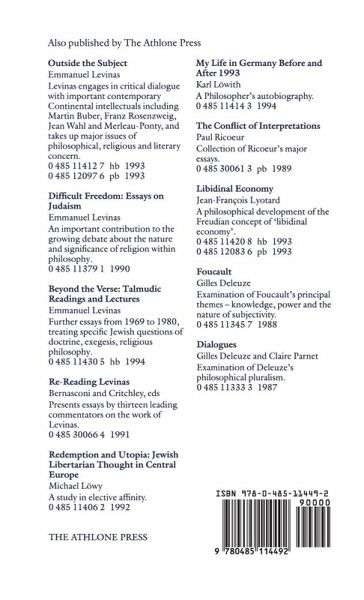The "Nations" are the "seventy nations": a metaphor which, in the Talmudic idiom, designates the whole of humanity surrounding Israel. In this major collection of essays, Levinas considers Judaism's uncertain relationship to European culture since the Enlightenment, problems of distance and integration. It also includes essays on Franz Rosenzweig and Moses Mendelssohn, and a discussion of central importance to Jewish philosophy in the context of general philosophy. This work brings to the fore the vital encounter between philosophy and Judaism, a hallmark of Levinas's thought.