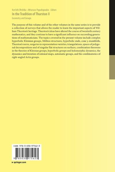 1 Ken'ichi Ohshika and Athanase Papadopoulos, Introduction.- 2 Michael Kapovich, A survey of complex hyperbolic Kleinian groups.- 3 Graham Smith, Möbius structures, hyperbolic ends and K-surfaces in hyperbolic space.- 4 Joan Porti, Cone 3-manifods.- 5 Takahiro Kitayama, A survey of the Thurston norm.- 6 Georgios Kydonakis, From hyperbolic Dehn filling to surgeries in representation varieties.- 7 Sang-Hyun Kim, Acute geodesic triangulations of manifolds.- 8 Ismail Saglam, Signature calculation of the area Hermitian form on some spaces of polygons.- 9 Mikhail Chernaviskikh, Altan Erdnigor, Nikita Kalinin, and Alexandr Zakharov, Equilateral convex triangulations of RP2 with three conical points of equal defect.- 10 Mahan Mj and Sabyasachi Mukherjee, Combination theorems in groups, geometry and dynamics.- 11 Kevin Pilgrim, On the pullback relation on curves induced by a Thurston map.- 12 William Floyd, The pullback map on Teichmüller space induced from a Thurston map.- 13 Russell Lodge, Yauhen Mikulich and Dierk Schleicher, A classification of postcritically finite Newton maps.- 14 Sarah Rees, The development of the theory of automatic groups.- 15 Thomas Koberda, Geometry and combinatorics via right-angled Artin groups.