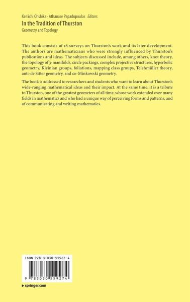 Preface. (Ken'ichi Ohshika and Athanase Papadopoulos).- Introduction. (Ken'ichi Ohshika and Athanase Papadopoulos).- Chapter 1: A glimpse into Thurston's work. (Ken'ichi Ohshika and Athanase Papadopoulos).- Chapter 2: Thurston's influence on Japanese topologists up to the 1980s. (Ken'ichi Ohshika).- Chapter 3: A survey of the impact of Thurston's work on Knot Theory. (Makoto Sakuma).- Chapter 4: Thurston's theory of 3-manifolds. (Sadayoshi Kojima).- Chapter 5: Combinatorics encoding geometry: The legacy of Bill Thurston in the story of one theorem. (Philip Bowers).- Chapter 6: On Thurston's parameterization of CP1-structures. (Shinpei Baba).- Chapter 7: A short proof of an assertion of Thurston concerning convex hulls. (Graham Smith).- Chapter 8: The double limit theorem and its legacy. (Cyril Lecuire).- Chapter 9: Geometry and topology of geometric limits. I. (Ken'ichi Ohshika and Teruhiko Soma).- Chapter 10: Laminar groups and 3-manifolds.(Hyungryul Baik and KyeongRo Kim).- Chapter 11: Length functions on currents and applications to dynamics and counting. (Viveka Erlandsson and Caglar Uyanik).- Chapter 12: Big mapping class groups: an overview. (Javier Aramayona and Nicholas Vlamis).- Chapter 13: Teichmuller theory, Thurston theory, Extremal length geometry and Complex analysis. (Hideki Miyachi).- Chapter 14: Signatures of monic polynomials. (Norbert A'Campo).- Chapter 15: Anti-de Sitter geometry and Teichmuller theory. (Francesco Bonsante and Andrea Seppi).- Chapter 16: Quasi-Fuchsian co-Minkowski manifolds. (Thierry Barbot and Francois Fillastre).