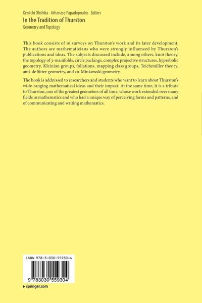 Preface. (Ken'ichi Ohshika and Athanase Papadopoulos).- Introduction. (Ken'ichi Ohshika and Athanase Papadopoulos).- Chapter 1: A glimpse into Thurston's work. (Ken'ichi Ohshika and Athanase Papadopoulos).- Chapter 2: Thurston's influence on Japanese topologists up to the 1980s. (Ken'ichi Ohshika).- Chapter 3: A survey of the impact of Thurston's work on Knot Theory. (Makoto Sakuma).- Chapter 4: Thurston's theory of 3-manifolds. (Sadayoshi Kojima).- Chapter 5: Combinatorics encoding geometry: The legacy of Bill Thurston in the story of one theorem. (Philip Bowers).- Chapter 6: On Thurston's parameterization of CP1-structures. (Shinpei Baba).- Chapter 7: A short proof of an assertion of Thurston concerning convex hulls. (Graham Smith).- Chapter 8: The double limit theorem and its legacy. (Cyril Lecuire).- Chapter 9: Geometry and topology of geometric limits. I. (Ken'ichi Ohshika and Teruhiko Soma).- Chapter 10: Laminar groups and 3-manifolds.(Hyungryul Baik and KyeongRo Kim).- Chapter 11: Length functions on currents and applications to dynamics and counting. (Viveka Erlandsson and Caglar Uyanik).- Chapter 12: Big mapping class groups: an overview. (Javier Aramayona and Nicholas Vlamis).- Chapter 13: Teichmuller theory, Thurston theory, Extremal length geometry and Complex analysis. (Hideki Miyachi).- Chapter 14: Signatures of monic polynomials. (Norbert A'Campo).- Chapter 15: Anti-de Sitter geometry and Teichmuller theory. (Francesco Bonsante and Andrea Seppi).- Chapter 16: Quasi-Fuchsian co-Minkowski manifolds. (Thierry Barbot and Francois Fillastre).