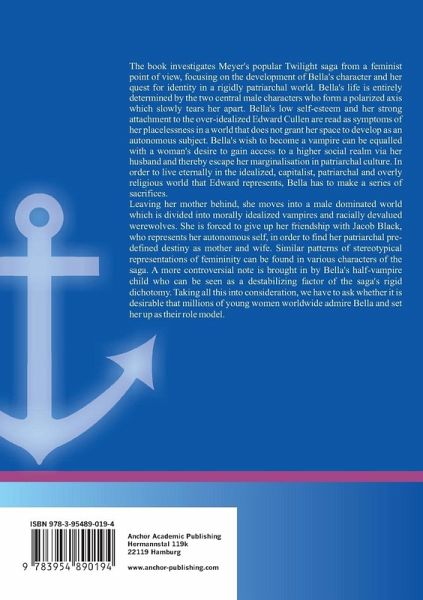 The book investigates Meyer s popular Twilight saga from a feminist point of view, focusing on the development of Bella s character and her quest for identity in a rigidly patriarchal world. Bella s life is entirely determined by the two central male characters who form a polarized axis which slowly tears her apart. Bella s low self-esteem and her strong attachment to the over-idealized Edward Cullen are read as symptoms of her placelessness in a world that does not grant her space to develop as an autonomous subject. Bella s wish to become a vampire can be equalled with a woman s desire to gain access to a higher social realm via her husband and thereby escape her marginalisation in patriarchal culture. In order to live eternally in the idealized, capitalist, patriarchal and overly religious world that Edward represents, Bella has to make a series of sacrifices. Leaving her mother behind, she moves into a male dominated world which is divided into morally idealized vampires and racially devalued werewolves. She is forced to give up her friendship with Jacob Black, who represents her autonomous self, in order to find her patriarchal pre-defined destiny as mother and wife. Similar patterns of stereotypical representations of femininity can be found in various characters of the saga. A more controversial note is brought in by Bella s half-vampire child who can be seen as a destabilizing factor of the saga s rigid dichotomy. Taking all this into consideration, we have to ask whether it is desirable that millions of young women worldwide admire Bella and set her up as their role model.