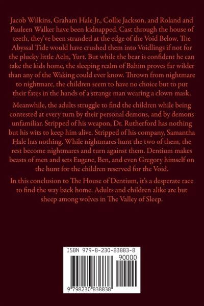 Jacob Wilkins, Graham Hale Jr., Collie Jackson, and Roland and Pauleen Walker have been kidnapped. Cast through the house of teeth, they've been stranded at the edge of the Void Below. The Abyssal Tide would have crushed them into Voidlings if not for the plucky little Aeln, Yurt. But while the bear is confident he can take the kids home, the sleeping realm of Bahim proves far wilder than any of the Waking could ever know. Thrown from nightmare to nightmare, the children seem to have no choice but to put their fates in the hands of a strange man wearing a clown mask. Meanwhile, the adults struggle to find the children while being contested at every turn by their personal demons, and by demons unfamiliar. Stripped of his weapon, Dr. Rutherford has nothing but his wits to keep him alive. Stripped of his company, Samantha Hale has nothing. While nightmares hunt the two of them, the rest become nightmares and turn against them. Dentium makes beasts of men and sets Eugene, Ben, and even Gregory himself on the hunt for the children reserved for the Void. In this conclusion to The House of Dentium, it's a desperate race to find the way back home. Adults and children alike are but sheep among wolves in The Valley of Sleep.