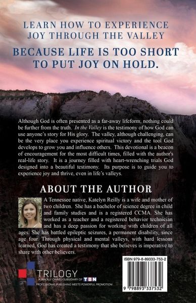 Although God is often Presented as a far-away lifeform, nothing could be further from the truth. In the Valley is the testimony of how God can use anyone's story for His glory. The valley, although challenging, can be the very place you experience spiritual victory and the tool God develops to grow you and influence others. This devotional is a beacon of encouragement for the most difficult times, filled with the author's real-life story. It is a journey filled with heart-wrenching trials God designed into a beautiful testimony. Its purpose is to guide you to experience joy and thrive, even in life's valleys.