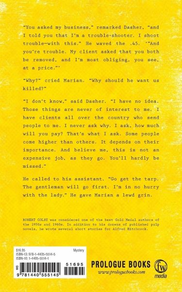 ''You asked my business,'' remarked Dasher, ''and I told you that I'm a trouble-shooter. I shoot trouble - with this.'' He waved the .45. ''And you're trouble. My client asked that you both be removed, and I'm most obliging, you see, at a price.'' ''Why?'' cried Marian. ''Why should he want us killed?'' ''I don't know,'' said Dasher. ''I have no idea. Those things are never of interest to me. I have clients all over the country who send people to me. I never ask why. I ask, how much will you pay? That's what I ask. Some people come higher than others. It depends on their importance. And believe me, this is not an expensive job, as they go. You'll hardly be missed.'' He called to his assistant. ''Go get the tarp. The gentleman will go first. I'm in no hurry with the lady.'' He gave Marian a lewd grin.