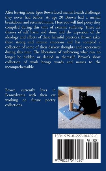 After leaving home, Igoe Bown faced mental health challenges they never had before. At age 20 Brown had a mental breakdown and returned home. Here you will find poety they compiled during this time of extreme suffering. There are themes of self harm and abuse and the expresion of the ideology and effects of these harmful practices. Brown takes these strong and intense emotions and has compled a collection of some of their darkest thoughts and experiences during this time. The liberation of embracing what can no longer be hidden or denied in themself, Brown's short collection of work brings words and names to the incomprehemsible.