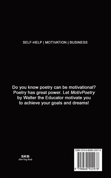 Do you know poetry can be motivational? Poetry has great power. Let MotivPoetry by Walter the Educator motivate you to achieve your goals and dreams. Creating a poetry book that motivates individuals to achieve their goals and dreams in life is a powerful tool for inspiration and personal growth. Poetry has a unique ability to touch the depths of emotions and ignite the spark of motivation within us. By using evocative language, vivid imagery, and rhythmic patterns, poetry can communicate profound messages in a concise and impactful manner. This poetry book focuses on motivation; it can serve as a constant reminder and source of encouragement for individuals on their journey towards their goals. It can provide solace during challenging times, instill belief in one's abilities, and offer guidance on overcoming obstacles. The words within these pages can act as a guiding light, reminding readers of their inner strength, resilience, and the limitless possibilities that lie ahead. Moreover, poetry has the power to connect people on a deeper level. It can create a sense of community and shared experiences, as readers resonate with the emotions and struggles portrayed in the verses. This connection can inspire individuals to push forward, knowing that they are not alone in their aspirations and challenges. In a world filled with distractions and negativity, this poetry book, focused on motivation, is a sanctuary of positivity and inspiration. It can provide readers with a much-needed respite from the chaos of everyday life and offer moments of reflection and introspection. The carefully chosen words can uplift spirits, ignite passions, and awaken dormant dreams. Ultimately, this poetry book motivates individuals to achieve their goals and dreams in life; it is a gift of encouragement, empowerment, and self-discovery. It can be a constant companion, offering solace, inspiration, and guidance on the journey towards personal and professional fulfillment. Through its verses, it has the potential to transform lives, reminding readers of their inherent worth, potential, and the endless possibilities that await them.