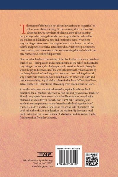 The stance of this book is not about showcasing our "expertise" on all we know about teaching. On the contrary, this is a book that describes how we have learned what we know about teaching - our journeys to becoming the teachers we are proud to be on behalf of the children and families we have and continue to serve. We explore why teaching matters to us. Our purpose here is to reflect on the values, beliefs, and practices we have as teachers who are reflective practitioners, conscientious, and committed to the work ensuring that each child in our care reaches his, her, their full potential. Our story that has led to the writing of this book reflects the work that these teachers do - their passion and commitment to it; the beliefs and attitudes they bring to the work; the challenges and frustrations faced in doing the work; the joy and excitement of the work; the lessons they have learned by the doing the work of teaching; what matters to them in doing the work; why it matters to them; and how it could matter to others who teach and care about teaching. A goal of this volume is that here, In Their Own Voices, actual teachers tell their stories of teaching from which others can learn. As teacher educators, committed to quality, equitable public-school education for all children, where do we find the next generation of teachers? How do we prepare them to enter the school house doors to work with children like and different from themselves? What is informing our academic on-campus preparation that reflects the lived experiences of teachers, children and their families, in the actual field of practice? This book raises these issues as it describes the relationship between a local public school on the Lower Eastside of Manhattan and its student teacher field supervisor from the University.