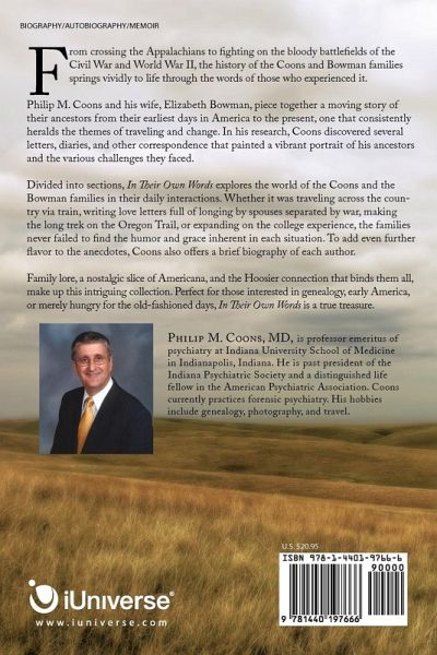 From crossing the Appalachians to fighting on the bloody battlefields of the Civil War and World War II, the history of the Coons and Bowman families springs vividly to life through the words of those who experienced it. Philip M. Coons and his wife, Elizabeth Bowman, piece together a moving story of their ancestors from their earliest days in America to the present, one that consistently heralds the themes of traveling and change. In his research, Coons discovered several letters, diaries, and other correspondence that painted a vibrant portrait of his ancestors and the various challenges they faced. Divided into sections, In Their Own Words explores the world of the Coons and the Bowman families in their daily interactions. Whether it was traveling across the country via train, writing love letters full of longing by spouses separated by war, making the long trek on the Oregon Trail, or expanding on the college experience, the families never failed to find the humor and grace inherent in each situation. To add even further flavor to the anecdotes, Coons also offers a brief biography of each author. Family lore, a nostalgic slice of Americana, and the Hoosier connection that binds them all, make up this intriguing collection. Perfect for those interested in genealogy, early America, or merely hungry for the old-fashioned days, In Their Own Words is a true treasure.