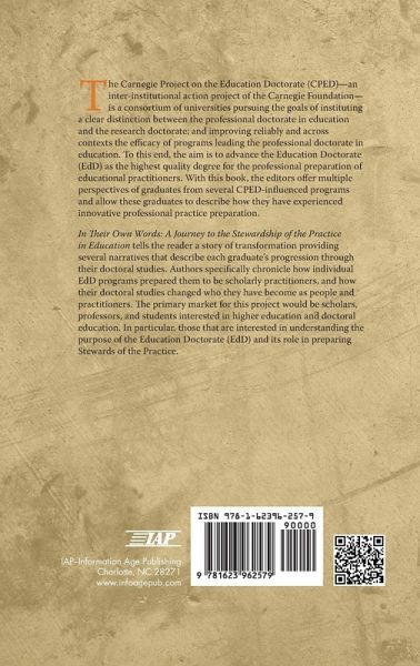 The Carnegie Project on the Education Doctorate (CPED)-an inter-institutional action project of the Carnegie Foundation-is a consortium of universities pursuing the goals of instituting a clear distinction between the professional doctorate in education and the research doctorate; and improving reliably and across contexts the efficacy of programs leading the professional doctorate in education. To this end, the aim is to advance the Education Doctorate (EdD) as the highest qualitydegree for the professional preparation of educational practitioners. With this book, the editors offer multiple perspectives of graduates from several CPED-influenced programs and allow these graduates to describe how they have experienced innovative professional practice preparation. The chapters in this book tell the reader a story of transformation providing several narratives that describe each graduate's progression through their doctoral studies. Authors specifically chronicle how individual EdD programs prepared them to be scholarly practitioners, and how their doctoral studies changed who they have become as people and practitioners. The primary market for this project would be scholars, professors, and students interested in higher education and doctoral education. In particular, those that are interested in understanding the purpose of the Education Doctorate (EdD) and its role in preparing Stewards of the Practice.