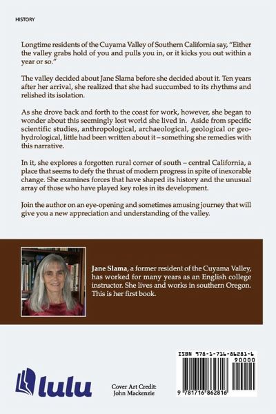 Longtime residents of the Cuyama Valley of Southern California say, "Either the valley grabs hold of you and pulls you in, or it kicks you out within a year or so." The valley decided about Jane Slama before she decided about it. Ten years after her arrival, she realized that she had succumbed to its rhythms and relished its isolation. As she drove back and forth to the coast for work, however, she began to wonder about this seemingly lost world she lived in. Aside from specific scientific studies, anthropological, archaeological, geological or geo-hydrological, little had been written about it - something she remedies with this narrative. In it, she explores a forgotten rural corner of south - central California, a place that seems to defy the thrust of modern progress in spite of inexorable change. She examines forces that have shaped its history and the unusual array of those who have played key roles in its development. Join the author on an eye-opening and sometimes amusing journey that will give you a new appreciation and understanding of the valley.