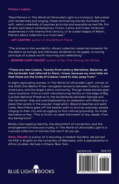 ""These are new Cubans. Twenty-first-century Marielitos. Balseros, as the bartender had referred to them. I know, because my mom tells me that these are the kinds of Cubans I need to stay away from." In eight captivating stories, In This World of Ultraviolet Light navigates tensions between Cubans, Cuban Americans, and the larger Latinx community. Though these stories span many locations-from a mulch manufacturing facility on the edge of Big Cypress National Preserve to the borderlands between Georgia and the Carolinas-they are overshadowed by an obsession with Miami as a place that exists in the popular imagination. Beyond beaches and palm trees, Raul Palma goes off the beaten path to portray everyday people clinging to their city and struggling to find cultural grounding. As Anjali Sachdeva writes, "This is fiction to steal the breath of any reader, from any background." Boldly interrogating identity, the discomfort of connection, and the entanglement of love and cruelty, In This World of Ultraviolet Light is a nuanced collection of stories that won't let you go"--