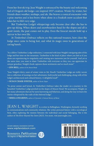 From her first ski trip, Jean Waight is entranced by the beauty and welcoming feel of Oregon's old lodge--an inspired 1937 creation. Winter by winter, her friends share weather, mishaps, and ale. She braves a comical encounter with a pine marten and is less brave when alone in a freakish snow accident that takes her to life's very edge. But Timberline Lodge's whisperings only become clear after she has to give up skiing. When skiers and snowboarders head for the slopes and all is quiet inside, the past comes out to play. Even the linocut murals hold up a mirror to her own life. In Timberline's Embrace reflects on this national treasure, how close the lodge once came to being lost, and what its magic owes to generations of caring hands.