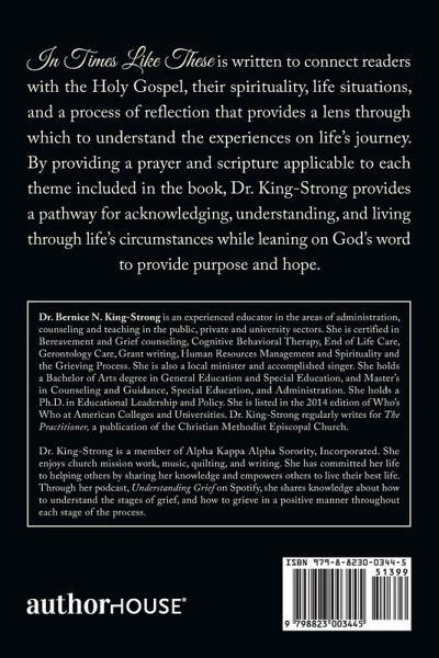 In Times Like These is written to connect readers with the Holy Gospel, their spirituality, life situations, and a process of reflection that provides a lens through which to understand the experiences on life's journey. By providing a prayer and scripture applicable to each theme included in the book, Dr. King-Strong provides a pathway for acknowledging, understanding, and living through life's circumstances while leaning on God's word to provide purpose and hope.