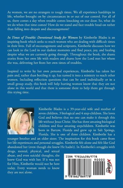 As women, we are no strangers to tough times. We all experience hardships in life, whether brought on by circumstances in or out of our control. For all of us, there comes a day when trouble comes knocking on our door. So, what do we do when that time comes? How do we stand and face trouble head-on rather than falling into despair and discouragement? In Times of Trouble: Devotional Study for Women by Kimberlie Blades is an inspiring book which seeks to reach women who are dealing with difficult times in their lives. Full of encouragement and scriptures, Kimberlie discusses how we can look to the Lord in our darkest moments and find peace, joy, and healing despite what we are currently going through. Throughout the book, she shares stories from her own life with readers and shares how the Lord met her where she was, delivering her from her own times of troubles. Inspired to write by her own personal experiences, Kimberlie has taken her pain and, rather than bottling it up, has turned it into a ministry to reach other women. Including reflection questions that can be used individually or in a small group study, this book will help hurting women know that they are not alone in this world and that there is someone there to help them get through this trying time. Kimberlie Blades is a 39-year-old wife and mother of seven children, 3 biological and 4 step-children. She loves God and believes that no one can make it through this life without Jesus Christ. She has three amazing biological children and four amazing stepchildren. Kimberlie was born in Bartow, Florida and grew up in Salt Springs, Florida. She is one of three children. Kimberlie has a younger brother and an older sister. The inspiration for this book came from her life experiences and personal struggles. Kimberlie felt alone and felt like God abandoned her (even though she knew He hadn't). In Kimberlie's struggles with drugs, mental, physical, and sexual abuse, and even suicidal thoughts, she knew God was with her. If it was not for Him, Kimberlie would not be here today. Every woman needs to know they are not alone.
