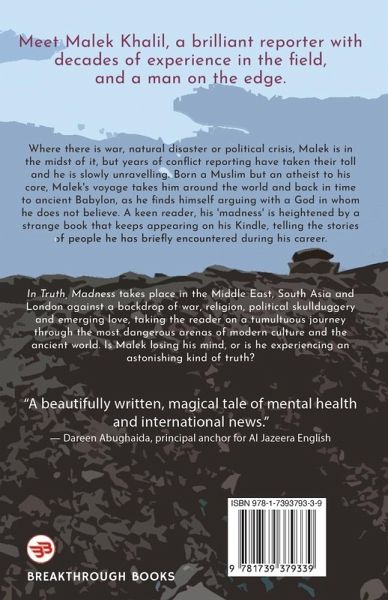 Meet Malek Khalil, a brilliant reporter with decades of experience in the field, and a man on the edge. Where there is war, natural disaster or political crisis, Malek is in the midst of it, but years of conflict reporting have taken their toll and he is slowly unravelling. Born a Muslim but an atheist to his core, Malek's voyage takes him around the world and back in time to ancient Babylon as he finds himself arguing with a God in whom he doesn't believe. A keen reader, his 'madness' is heightened by a strange book that keeps appearing on his Kindle, telling the stories of people he has briefly encountered during his career. In Truth, Madness takes place throughout the Middle East, South Asia and London against a backdrop of war, religion, political skullduggery and emerging love, taking the reader on a tumultuous journey through the most dangerous arenas of modern culture and the ancient world. Is Malek losing his mind, or is he experiencing an astonishing kind of truth?