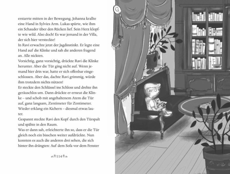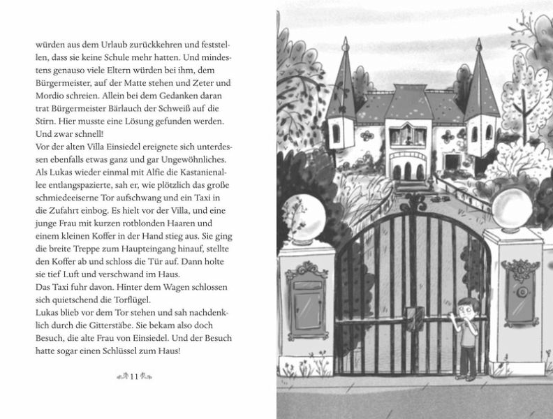 Einzug läuft nicht so glatt, wie gehofft: Plötzlich ertönt Klaviermusik aus einem leeren Zimmer,…mehrDa ein Tornado das Schulgebäude zerstört hat, müssen alle Schüler und Lehrer in die alte Villa Einsiedel umziehen. Der Besitzerin ist das eigentlich gar nicht recht, aber da sie im Heim sitzt und das Gebäude leer steht, ist es die einzige Möglichkeit, den Schulbetrieb wieder aufzunehmen. Doch der Einzug läuft nicht so glatt, wie gehofft: Plötzlich ertönt Klaviermusik aus einem leeren Zimmer, Schilder werden vertauscht, Standuhren verrückt und Türen sind verschlossen. Einige Schüler beginnen zu ermitteln, wer hinter den Streichen stecken könnte.