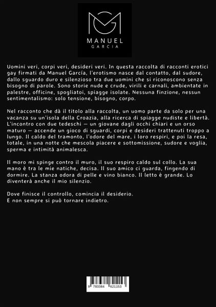Uomini veri, corpi veri, desideri veri. In questa raccolta di racconti erotici gay firmati da Manuel García, l'erotismo nasce dal contatto, dal sudore, dallo sguardo duro e silenzioso tra due uomini che si riconoscono senza bisogno di parole. Sono storie nude e crude, virili e carnali, ambientate in palestre, officine, spogliatoi, spiagge isolate. Nessuna finzione, nessun sentimentalismo: solo tensione, bisogno, corpo.Nel racconto che dà il titolo alla raccolta, un uomo parte da solo per una vacanza su un'isola della Croazia, alla ricerca di spiagge nudiste e libertà. L'incontro con due tedeschi - un giovane dagli occhi chiari e un orso maturo - accende un gioco di sguardi, corpi e desideri trattenuti troppo a lungo. Il caldo del tramonto, l'odore del mare, i loro respiri, e poi la resa, totale, in una notte che mescola piacere e sottomissione, sudore e voglia, sperma e intimità animalesca.Il moro mi spinge contro il muro, il suo respiro caldo sul collo. La sua mano è tra le mie natiche, decisa. Il suo amico ci guarda, fingendo di dormire. La stanza odora di pelle e vino bianco. Il letto è grande. Lo diventerà anche il mio silenzio.Dove finisce il controllo, comincia il desiderio.E non sempre si può tornare indietro.