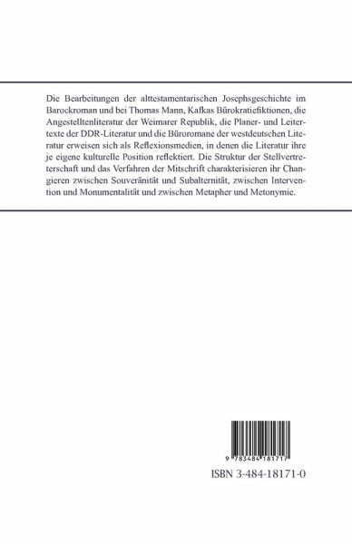Mit den Figuren des Beamten, des Sekretärs, des Angestellten und in der Struktur der Stellvertreterschaft analysiert die Literatur ihre eigene kulturelle Position zwischen providentieller Souveränität und passiver Subalternität, zwischen Intervention und Monumentalität, zwischen Metapher und Metonymie. In den literarischen Bearbeitungen der alttestamentarischen Josephsgeschichte im Barockroman und bei Thomas Mann, in Franz Kafkas Bürokratiefiktionen, in der Angestelltenliteratur der Weimarer Republik, in der Planer- und Leiterprogrammatik der DDR-Literatur und in den Büro- und Angestelltenromanen der Literatur der Bundesrepublik lassen sich Mitschriften von je unterschiedlichen Stellvertreterschaften erkennen, die den Status der Literatur selbstreferentiell ins Spiel bringen. In der Stellvertreterschaft wird die Entkopplung von Personen und Stellen, die Ersetzbarkeit des einzelnen und schließlich die Arbitrarität, aber auch die Bemächtigung der Zeichen innerhalb einer Rhetorik der Moderne virulent. Der Begriff der Mitschrift verweist auf die zwischen metaphorischer Ähnlichkeit und metonymischer Kontiguität changierende Bindung literarischer Texte an plausibel zu machende Kontexte; literarische Mitschriften entfalten sich hier zwischen passiver Abhängigkeit und selektiv-hermeneutischem Vor- und Eingriff.