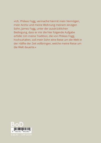 »Ich, Phileas Fogg, vermache hiermit mein Vermögen, mein Archiv und meine Wohnung meinem einzigen Sohn, James Fogg, unter der ausdrücklichen Bedingung, dass er mir die hier folgende Aufgabe erfülle: Um meine Tradition, die von Phileas Fogg, hochzuhalten, soll mein Sohn eine Reise um die Welt in der Hälfte der Zeit vollbringen, welche meine Reise um die Welt dauerte.«
