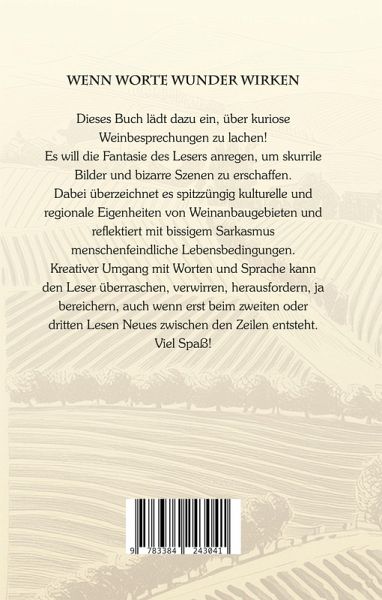 Wenn Worte Wunder wirken: Dieses Buch lädt dazu ein, über kuriose Weinbesprechungen zu lachen! Es will die Fantasie des Lesers anregen, um skurrile Bilder und bizarre Szenen zu erschaffen. Dabei überzeichnet es spitzzüngig kulturelle und regionale Eigenheiten von Weinanbaugebieten und reflektiert mit bissigem Sarkasmus menschenfeindliche Lebensbedingungen. Kreativer Umgang mit Worten und Sprache kann den Leser überraschen, verwirren, herausfordern, ja bereichern, auch wenn erst beim zweiten oder dritten Lesen Neues zwischen den Zeilen entsteht. Viel Spaß!