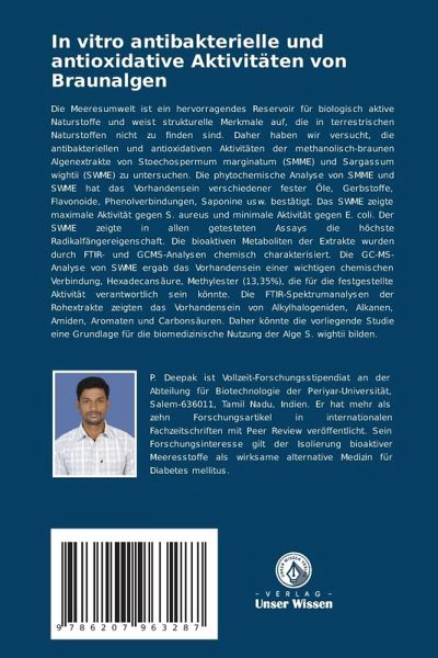 Die Meeresumwelt ist ein hervorragendes Reservoir für biologisch aktive Naturstoffe und weist strukturelle Merkmale auf, die in terrestrischen Naturstoffen nicht zu finden sind. Daher haben wir versucht, die antibakteriellen und antioxidativen Aktivitäten der methanolisch-braunen Algenextrakte von Stoechospermum marginatum (SMME) und Sargassum wightii (SWME) zu untersuchen. Die phytochemische Analyse von SMME und SWME hat das Vorhandensein verschiedener fester Öle, Gerbstoffe, Flavonoide, Phenolverbindungen, Saponine usw. bestätigt. Das SWME zeigte maximale Aktivität gegen S. aureus und minimale Aktivität gegen E. coli. Der SWME zeigte in allen getesteten Assays die höchste Radikalfängereigenschaft. Die bioaktiven Metaboliten der Extrakte wurden durch FTIR- und GCMS-Analysen chemisch charakterisiert. Die GC-MS-Analyse von SWME ergab das Vorhandensein einer wichtigen chemischen Verbindung, Hexadecansäure, Methylester (13,35%), die für die festgestellte Aktivität verantwortlich sein könnte. Die FTIR-Spektrumanalysen der Rohextrakte zeigten das Vorhandensein von Alkylhalogeniden, Alkanen, Amiden, Aromaten und Carbonsäuren. Daher könnte die vorliegende Studie eine Grundlage für die biomedizinische Nutzung der Alge S. wightii bilden.