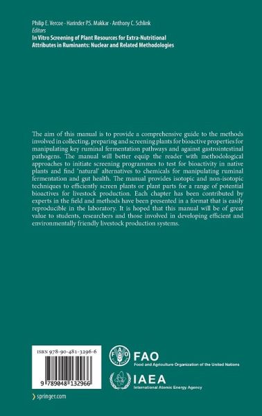 The aim of this manual is to provide a comprehensive guide to the methods involved in collecting, preparing and screening plants for bioactive properties for manipulating key ruminal fermentation pathways and against gastrointestinal pathogens. The manual will better equip the reader with methodological approaches to initiate screening programmes to test for bioactivity in native plants and find 'natural' alternatives to chemicals for manipulating ruminal fermentation and gut health. The manual provides isotopic and non-isotopic techniques to efficiently screen plants or plant parts for a range of potential bioactives for livestock production. Each chapter has been contributed by experts in the field and methods have been presented in a format that is easily reproducible in the laboratory. It is hoped that this manual will be of great value to students, researchers and those involved in developing efficient and environmentally friendly livestock production systems.