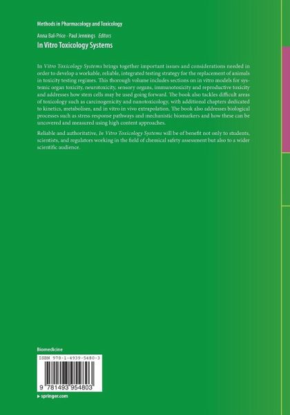In Vitro Toxicology Systems brings together important issues and considerations needed in order to develop a workable, reliable, integrated testing strategy for the replacement of animals in toxicity testing regimes. This thorough volume includes sections on in vitro models for systemic organ toxicity, neurotoxicity, sensory organs, immunotoxicity and reproductive toxicity and addresses how stem cells may be used going forward. The book also tackles difficult areas of toxicology such as carcinogenicity and nanotoxicology, with additional chapters dedicated to kinetics, metabolism, and in vitro in vivo extrapolation. The book also addresses biological processes such as stress response pathways and mechanistic biomarkers and how these can be uncovered and measured using high content approaches.