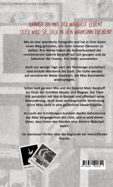 Mia ist eine talentierte Fotografin und hat in ihrer Kunst einen Weg gefunden, sich ihren inneren Dämonen zu stellen. Ihre Werke haben die Aufmerksamkeit der renommierten Galerie Berghoff auf sich gezogen und sie bekommt die Chance, ihre Bilder auszustellen.Doch nur wenige Tage nach der Vernissage erschüttert eine brutale Mordserie die Stadt. Die Opfer werden auf verstörende Weise inszeniert und spiegeln dabei Mias Kunstwerke wider.Schon bald geraten Mia und der Galerist Marc Berghoff ins Visier der Ermittler Kessler und Wagner. Der Täter tritt persönlich mit Mia in Kontakt und offenbart seine Bewunderung, doch diese verhängnisvolle Verbindung stürzt Mias Geist in eine gefährliche Abwärtsspirale. Im Laufe der Ermittlungen kommen dunkle Geheimnisse aus Mias Vergangenheit ans Licht, und es wird immer klarer, dass hinter den Morden eine düstere Wahrheit lauert. Ein atemloser Thriller über die Abgründe der menschlichen Psyche.Der erste Fall für das Ermittlerteam Kessler und Wagner