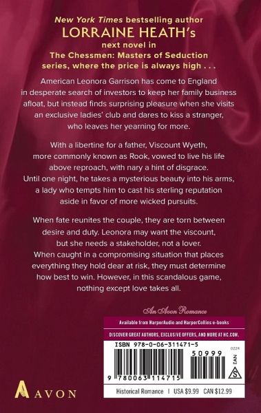 New York Times bestselling author Lorraine Heath’s next novel in The Chessmen: Masters of Seduction series where the price is always high… American Leonora Garrison has come to England in desperate search of investors to keep her family business afloat but instead finds surprising pleasure when she visits an exclusive ladies’ club and dares to kiss a stranger, who leaves her yearning for more. With a libertine for a father, Viscount Wyeth, more commonly known as Rook, vowed to live his life above reproach, with nary a hint of disgrace. Until one night, he takes a mysterious beauty into his arms, a lady who tempts him to cast his sterling reputation aside in favor of more wicked pursuits. When fate reunites the couple, they are torn between desire and duty. Leonora may want the viscount, but she needs a stakeholder not a lover. When caught in a compromising situation that places everything they hold dear at risk, they must determine how best to win. However, in this scandalous game, nothing except love takes all.