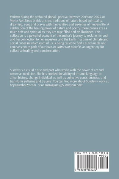 Written during the profound global upheaval between 2019 and 2023, In Water Not Blood braids ancient traditions of nature-based spirituality, dreaming, song and prayer with the realities and anxieties of modern life. A celebration of the healing power of nature and poetry, these poems are as much soft and spiritual as they are rage-filled and disillusioned. This collection is a powerful account of the author's journey to reclaim her soul and her connection to her ancestors and the Earth in a time of climate and social crises in which each of us is being called to find a sustainable and compassionate path of our own. In Water Not Blood is an urgent cry for collective healing and transformation.