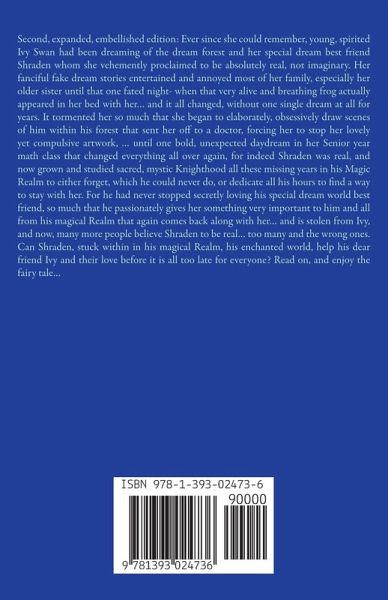 Second, expanded, embellished edition: Ever since she could remember, young, spirited Ivy Swan had been dreaming of the dream forest and her special dream best friend Shraden whom she vehemently proclaimed to be absolutely real, not imaginary. Her fanciful fake dream stories entertained and annoyed most of her family, especially her older sister until that one fated night- when that very alive and breathing frog actually appeared in her bed with her... and it all changed, without one single dream at all for years. It tormented her so much that she began to elaborately, obsessively draw scenes of him within his forest that sent her off to a doctor, forcing her to stop her lovely yet compulsive artwork, ... until one bold, unexpected daydream in her Senior year math class that changed everything all over again, for indeed Shraden was real, and now grown and studied sacred, mystic Knighthood all these missing years in his Magic Realm to either forget, which he could never do, or dedicate all his hours to find a way to stay with her. For he had never stopped secretly loving his special dream world best friend, so much that he passionately gives her something very important to him and all from his magical Realm that again comes back along with her... and is stolen from Ivy, and now, many more people believe Shraden to be real... too many and the wrong ones. Can Shraden, stuck within in his magical Realm, his enchanted world, help his dear friend Ivy and their love before it is all too late for everyone? Read on, and enjoy the fairy tale...