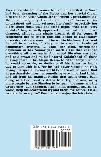 The original, updated, illustrated version~ Ever since she could remember, young, spirited Ivy Swan had been dreaming of the Forest and her special dream best friend Shraden whom she vehemently proclaimed was Real, not imaginary. Her "fanciful fake" dream stories entertained and annoyed most her family, especially her older sister until that one fated night- with that "very un-fake" frog actually appeared in her bed... and it all changed, without one single dream at all for years. It tormented her so much that she began to elaborately, obsessively draw scenes of him within his forest that sent her off to a doctor, forcing her to stop her lovely yet compulsive artwork, ... until one bold, unexpected daydream in her Senior year math class that changed everything all over again, for indeed Shraden was real, and now grown and studied sacred Knighthood all these missing years in his Magic Realm to either forget, which he could never do, or dedicate all his hours to find a way to stay with her. For he had never stopped secretly loving his special dream world best friend, so much that he passionately gives her something very important to him and all from his magical Realm that again comes back along with her... and is stolen from Ivy, and now, many more people believe Shraden to be real... too many and the wrong ones. Can Shraden, stuck in his magical Realm, his world, help his dear friend Ivy and their love before it is all too late for everyone? Read on, and enjoy the fairy tale...