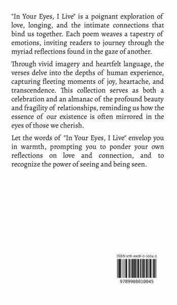 "In Your Eyes, I Live" is a poignant exploration of love, longing, and the intimate connections that bind us together. Each poem weaves a tapestry of emotions, inviting readers to journey through the myriad reflections found in the gaze of another. Through vivid imagery and heartfelt language, the verses delve into the depths of human experience, capturing fleeting moments of joy, heartache, and transcendence. This collection serves as both a celebration and an almanac of the profound beauty and fragility of relationships, reminding us how the essence of our existence is often mirrored in the eyes of those we cherish. Let the words of "In Your Eyes, I Live" envelop you in warmth, prompting you to ponder your own reflections on love and connection, and to recognize the power of seeing and being seen.
