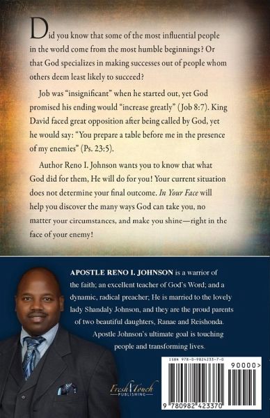 Did you know that some of the most influential people in the world come from the most humble beginnings? Or that God specializes in making successes out of people whom others deem least likely to succeed? Job was "insignificant" when he started out, yet God promised his ending would "increase greatly" (Job 8:7). King David faced great opposition after being called by God, yet he would say: "You prepare a table before me in the presence of my enemies" (Ps. 23:5). Author Reno I. Johnson wants you to know that what God did for them, He will do for you! Your current situation does not determine your final outcome. In Your Face!!! will help you discover the many ways God can take you, no matter your circumstances, and make you shine-right in the face of your enemy!
