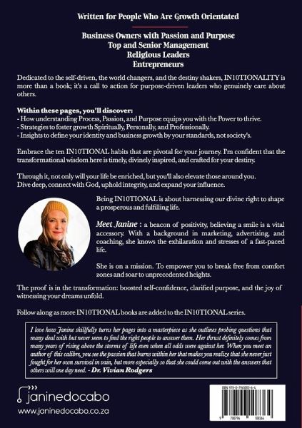 IN10TIONALITY is written for people who are growth orientated, business owners with passion and purpose, top senior management, religious leaders, and entrepreneurs. People who normally talk and surround themselves with others who are highly motivated, self-driven, world changers, destiny shakers, and purpose driven leaders. People of whom teaching, communicating, and leading people all have one thing in common - genuinely caring for people. You will be able to easily understand, implement and use the knowledge to further enrich the lives of people around you as well as your own. Apply the wisdom in the comping pages to your own life. Grow in intimacy with God, Godly integrity, stature, and influence. Janine is a firm believer in positive thinking and believes that you are never fully dressed without a smile. Her mission is to empower you by giving you the knowledge and resources you need to escape your comfort zone and reach your highest potential. Her background is in the fast-paced world of marketing, advertising, and coaching, so she understands first-hand the thrill of life in the fast lane as well as the stress it can lead to for many people. Her focus is to help you realise and reach your aspirations for work and life. Her results speak of radical improvement of your self-confidence, crystal clear clarity on your purpose, and the satisfaction of seeing your vision come to life.