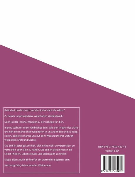 Befindest du dich auch auf der Suche nach dir selbst? Zu deiner ursprünglichen, wahrhaften Weiblichkeit? Dann ist der Inanna-Weg genau der richtige für dich.Inanna steht für unser weibliches Sein. Wie der Krieger des Lichts uns hilft die männlichen Qualitäten in uns zu finden und zu integrieren, begleitet Inanna uns auf dem Weg zu unserer wahren weiblichen Kraft und Stärke.Die Zeit ist jetzt gekommen, dich nicht mehr zu verstecken, zu verrenken oder klein zu halten. Die Zeit ist gekommen in dir selbst Frieden, Lebensfreude und Lebenssinn zu finden.Möge dieses Buch dir hierfür ein wertvoller Begleiter sein.Herzensgrüße, deine Jennifer Weidmann