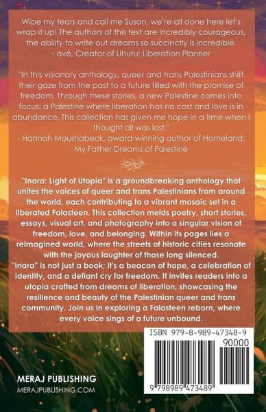 "Inara: Light of Utopia" is a groundbreaking anthology that unites the voices of queer and trans Palestinians from around the world, each contributing to a vibrant mosaic set in a liberated Falasteen. This collection melds poetry, short stories, essays, visual art, and photography into a singular vision of freedom, love, and belonging. Within its pages lies a reimagined world, where the streets of historic cities resonate with the joyous laughter of those long silenced. "Inara" is not just a book; it's a beacon of hope, a celebration of identity, and a defiant cry for freedom. It invites readers into a utopia crafted from dreams of liberation, showcasing the resilience and beauty of the Palestinian queer and trans community. Join us in exploring a Falasteen reborn, where every voice sings of a future unbound.