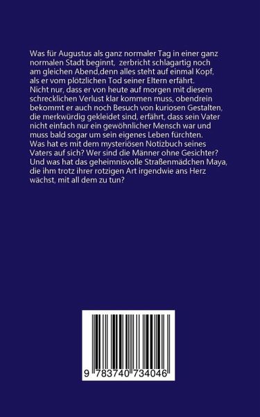 Was für Augustus als ganz normaler Tag in einer ganz normalen Stadt beginnt, zerbricht schlagartig noch am gleichen Abend, denn alles steht auf einmal Kopf, als er vom plötzlichen Tod seiner Eltern erfährt. Nicht nur, dass er von heute auf morgen mit diesem schrecklichen Verlust klar kommen muss, obendrein bekommt er auch noch Besuch von kuriosen Gestalten, die merkwürdig gekleidet sind, erfährt, dass sein Vater nicht einfach nur ein gewöhnlicher Mensch war und muss bald sogar um sein eigenes Leben fürchten. Was hat es mit dem mysteriösen Notizbuch seines Vaters auf sich? Wer sind die Männer ohne Gesichter? Und was hat das geheimnisvolle Straßenmädchen Maya, die ihm trotz ihrer rotzigen Art irgendwie ans Herz wächst, mit all dem zu tun?Coverdesign: André Thaleikis